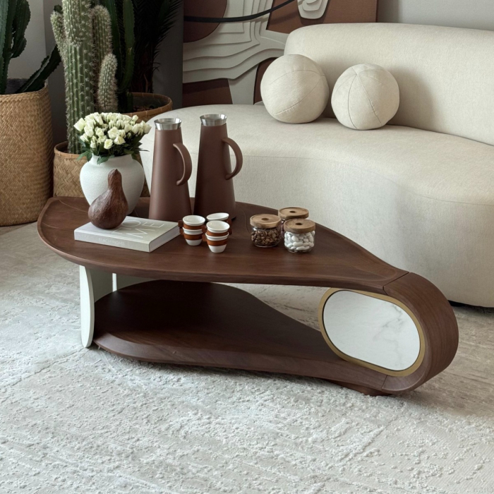 A true masterpiece of design, this leaf-shaped coffee table brings an artistic and organic essence to your living space. Inspired by nature, its flowing contours and intricate detailing mimic the elegance of a real leaf, making it a statement piece that stands out in any modern interior. The convertible and expandable feature adds a layer of functionality, allowing you to adjust the table to suit different occasions and needs. Crafted from a harmonious blend of wood and marble, it perfectly balances warmth and luxury, while the rich walnut color enhances its natural appeal. Whether placed in a minimalist setting or a bold contemporary space, this coffee table effortlessly elevates the ambiance with its sculptural beauty and practical versatility.