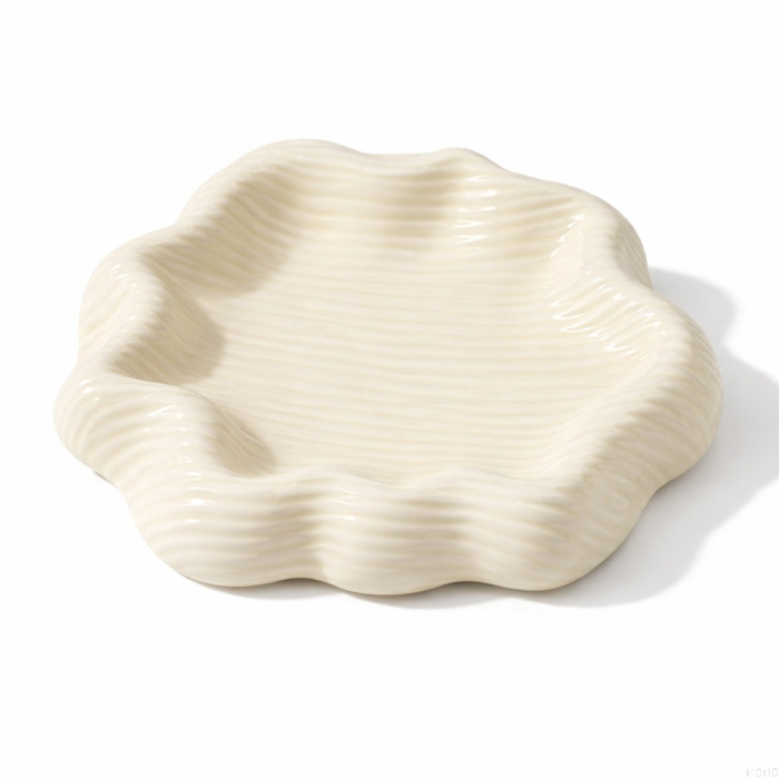 قطعة خزفية بتصميم متماوج مستوحى من حركة الأصداف الطبيعية، بلمسة لامعة ونقوش خفيفة تعكس الضوء بانسيابية. تضيف حضورًا فنيًا ناعمًا لأي مساحة، وتُستخدم كصينية للقطع الصغيرة أو كعنصر تزييني منفرد. حجمها الصغير يجعلها مثالية للطاولات الجانبية أو الكونسول