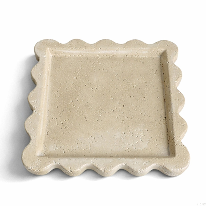 صينية مربعة من السيراميك بتفاصيل ناعمة وحواف متموجة مستوحاة من أشكال طبيعية. سطحها غير لامع يعكس لمسة حجرية دافئة، مما يجعلها خيارًا أنيقًا لتنسيق الطاولات أو عرض الإكسسوارات. تصميمها البسيط مع الخطوط المنحنية يضفي عليها حضورًا فنيًا يعزز من جمالية أي مساحة توضع بها.